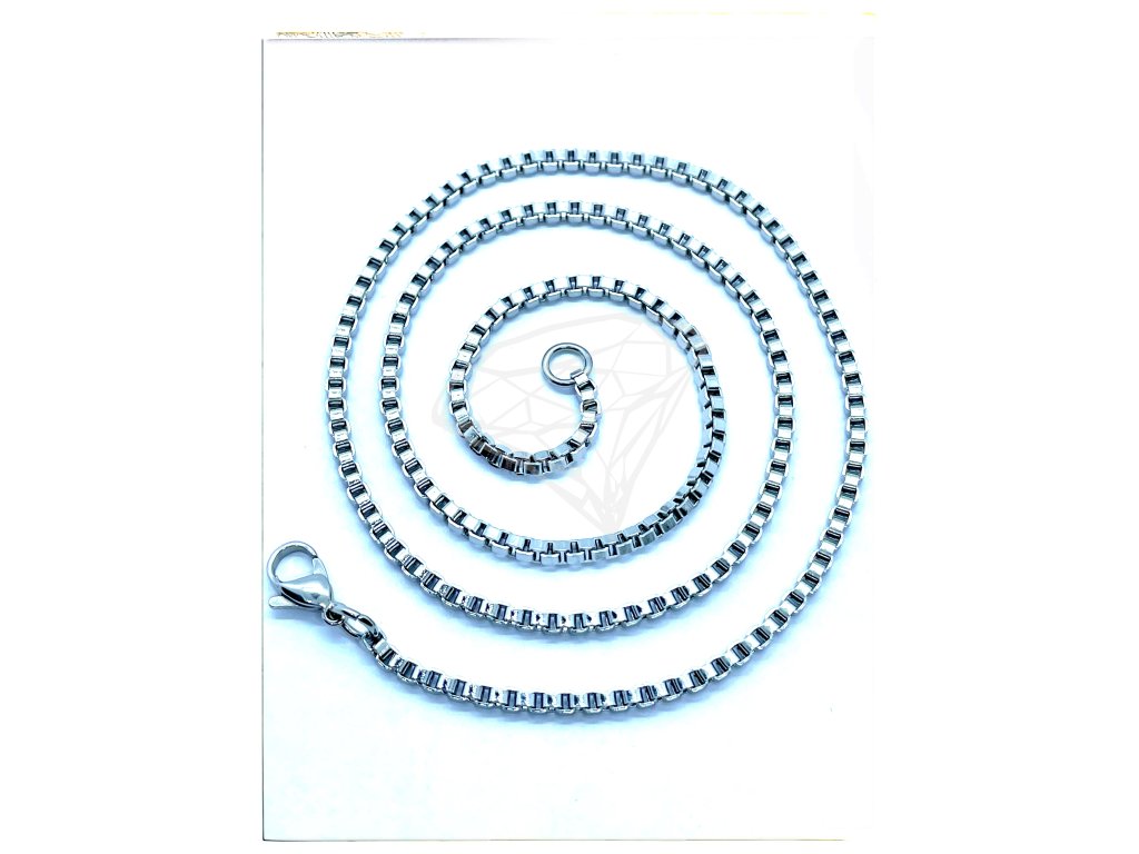 Délka řetízku 36 - 50 cm, šířka očka 0,15 cm. Řetízek má hranatý tvar. Řetízek je vhodný k přívěsku. Zapínání na karabinu. Materiál: chirurgická ocel