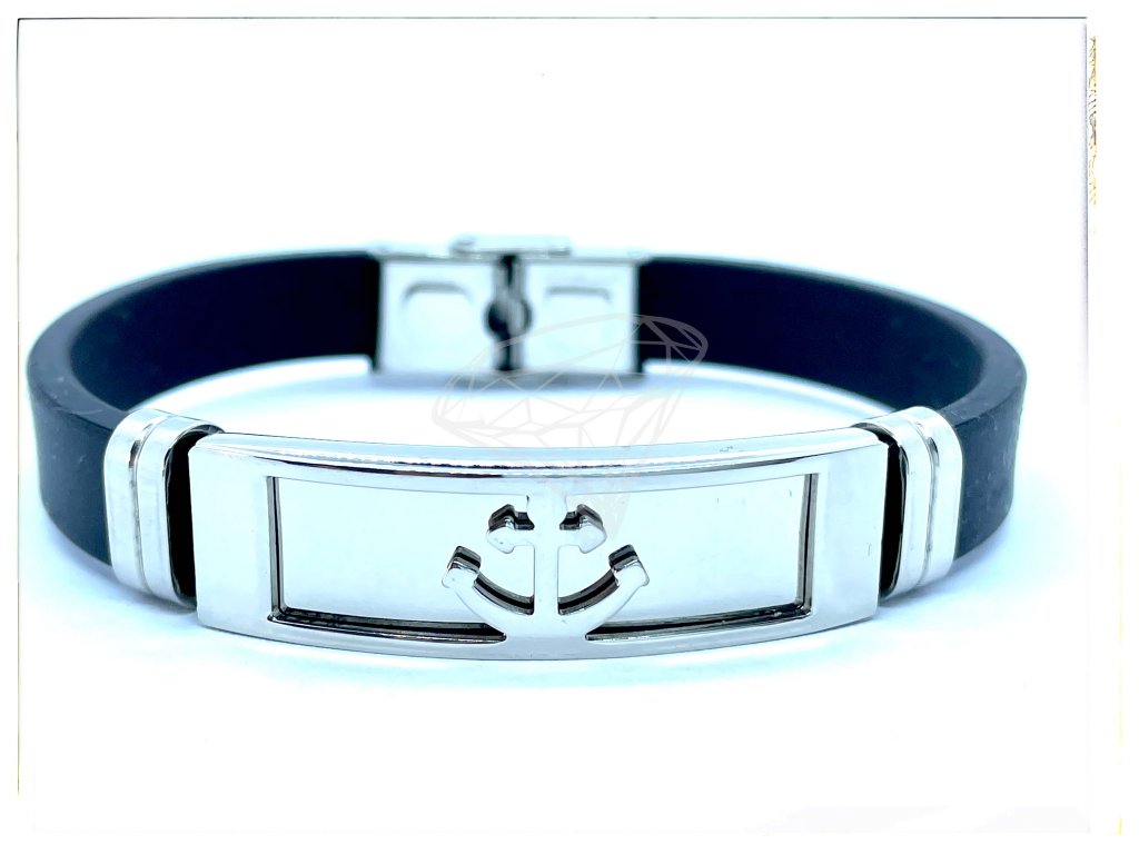 Lesklá ocelová ploška s vyřezanou kotvou. Podklad pod kotvou je černý. Kaučuk/guma je pružný omyvatelný materiál. Šířka kaučuku 1,0 cm. Délka náramku 20 cm. Ocelové...